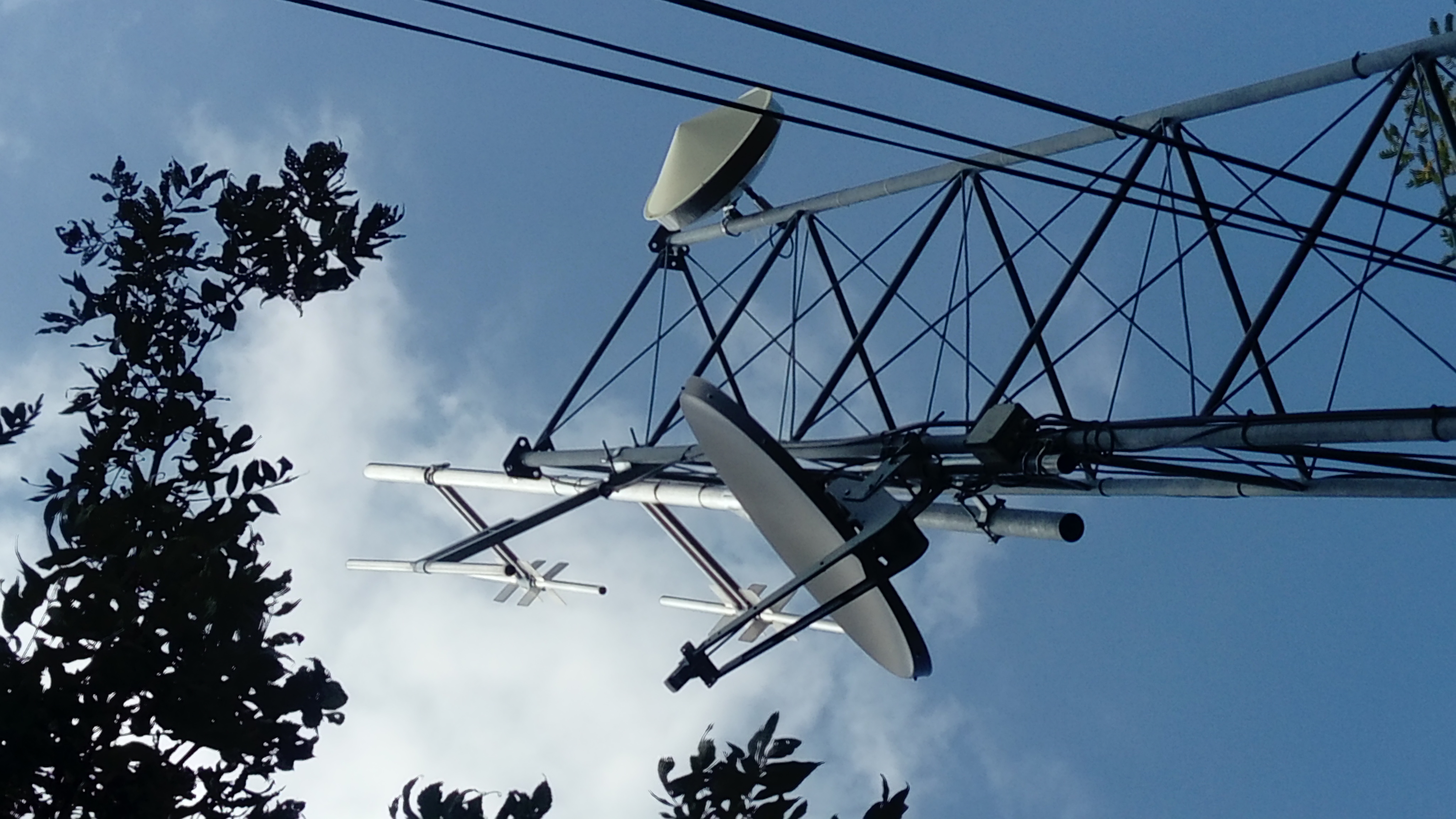 Programme reçu par satellite (fréquence 12690 MHz, polarisation verticale, modulation 8PSK, SR 29950, FEC 3/4), émetteur dans l'armoire derrière le pylône.